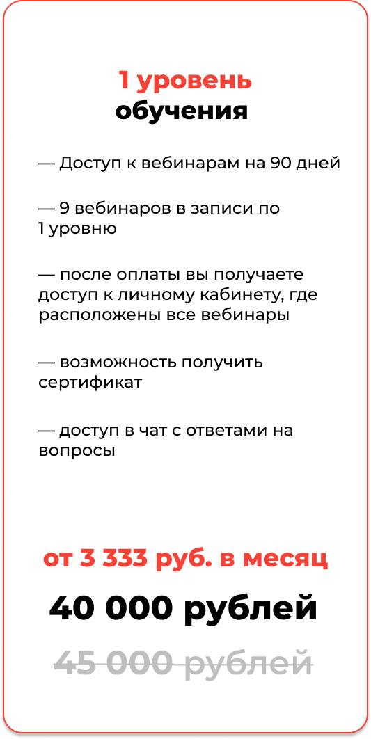 У вас есть возможность приобрести все 3 уровня(полный пакет) в рассрочку без процентов. Рассрочка в 3 платежа: