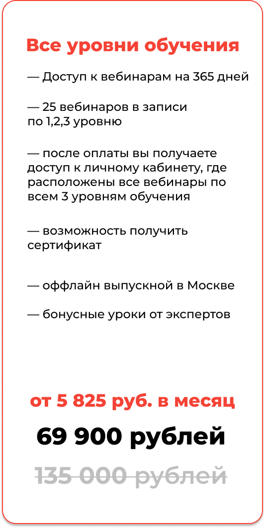 У вас есть возможность приобрести все 3 уровня(полный пакет) в рассрочку без процентов. Рассрочка в 3 платежа:
